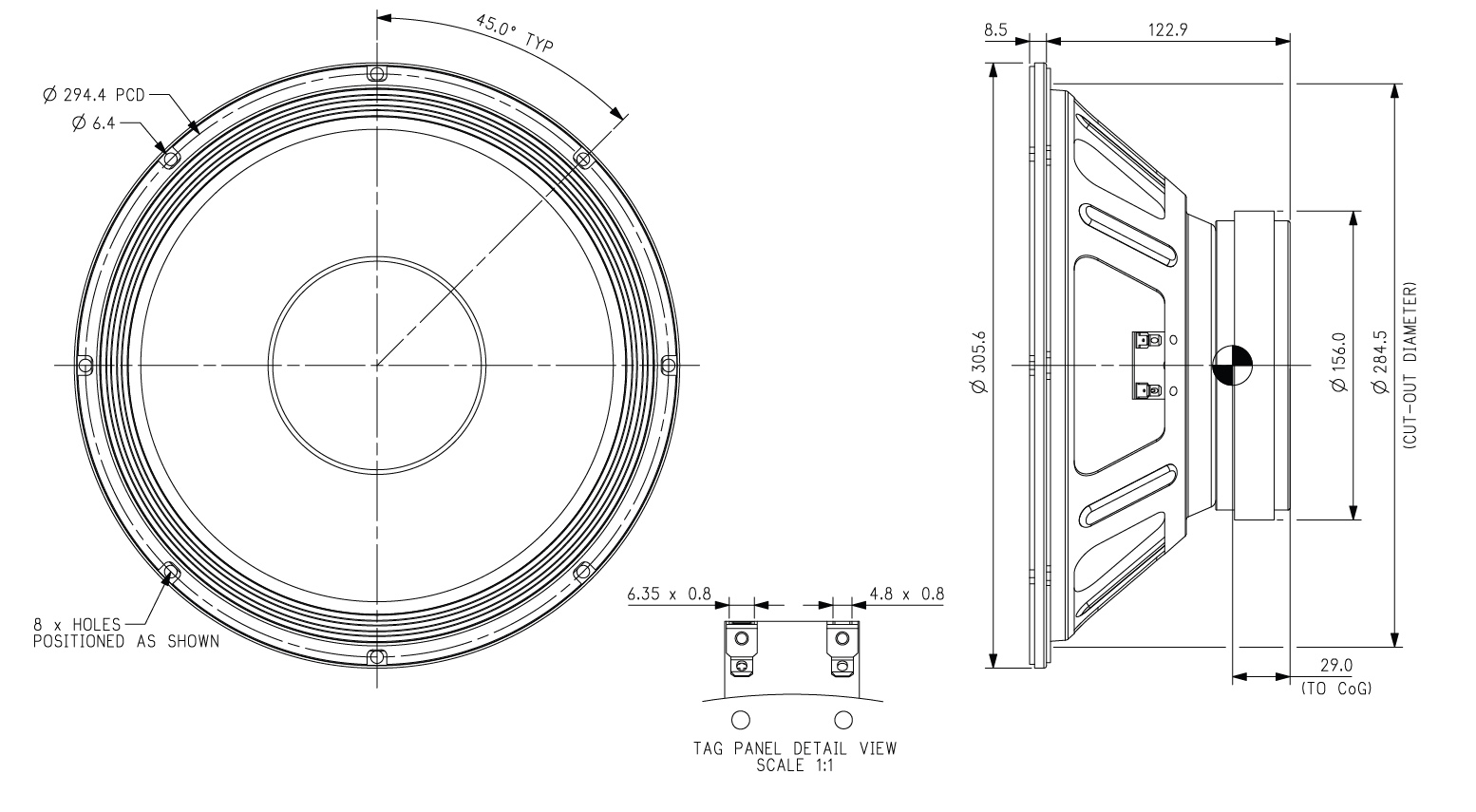 12-inch pressed steel chassis, ferrite magnet mid/bass driver