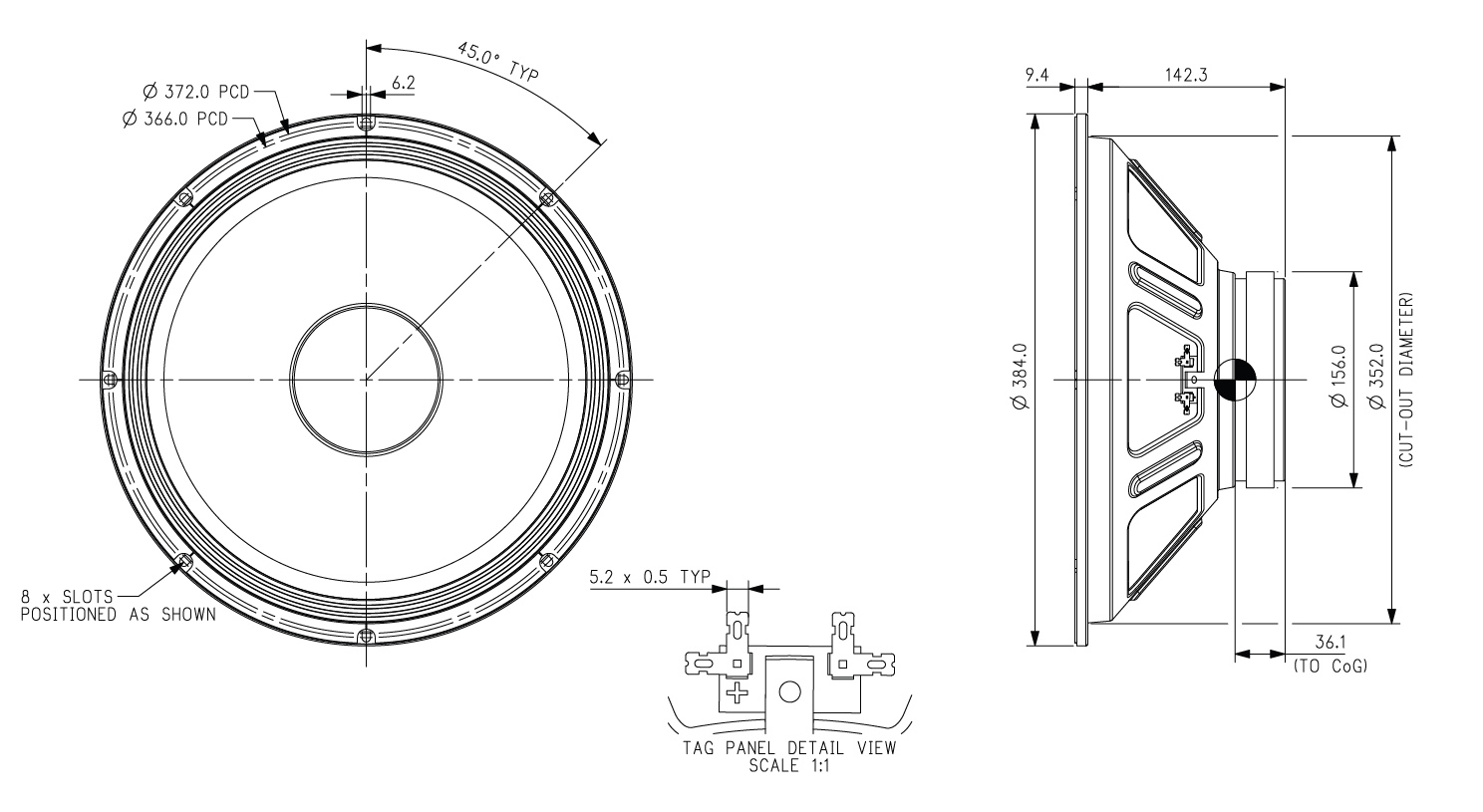 15-inch pressed steel chassis, ferrite magnet mid/bass driver